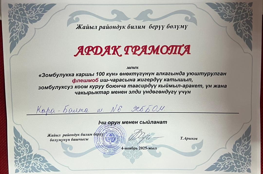 В целях предупреждения всех форм насилия, обеспечения обучения детей в безопасной среде мэрия города Кара-Балта провела конкурс среди учащихся 5-11 классов «100 дней без насилия»