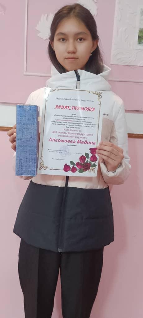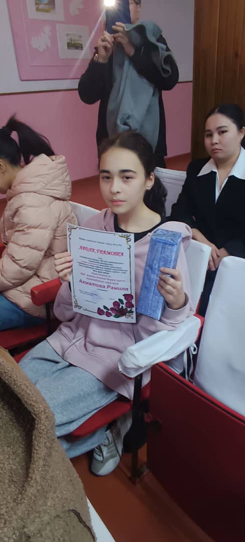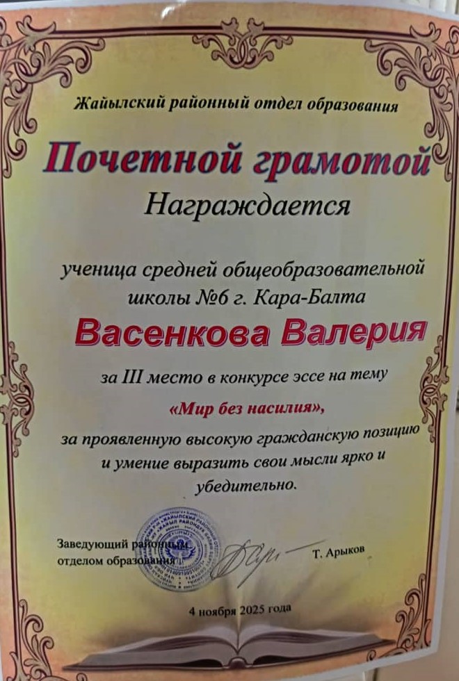 1 место – конкурс эссе «Мир без насилия» – ученица 8 А класса Куватпекова Даяна
