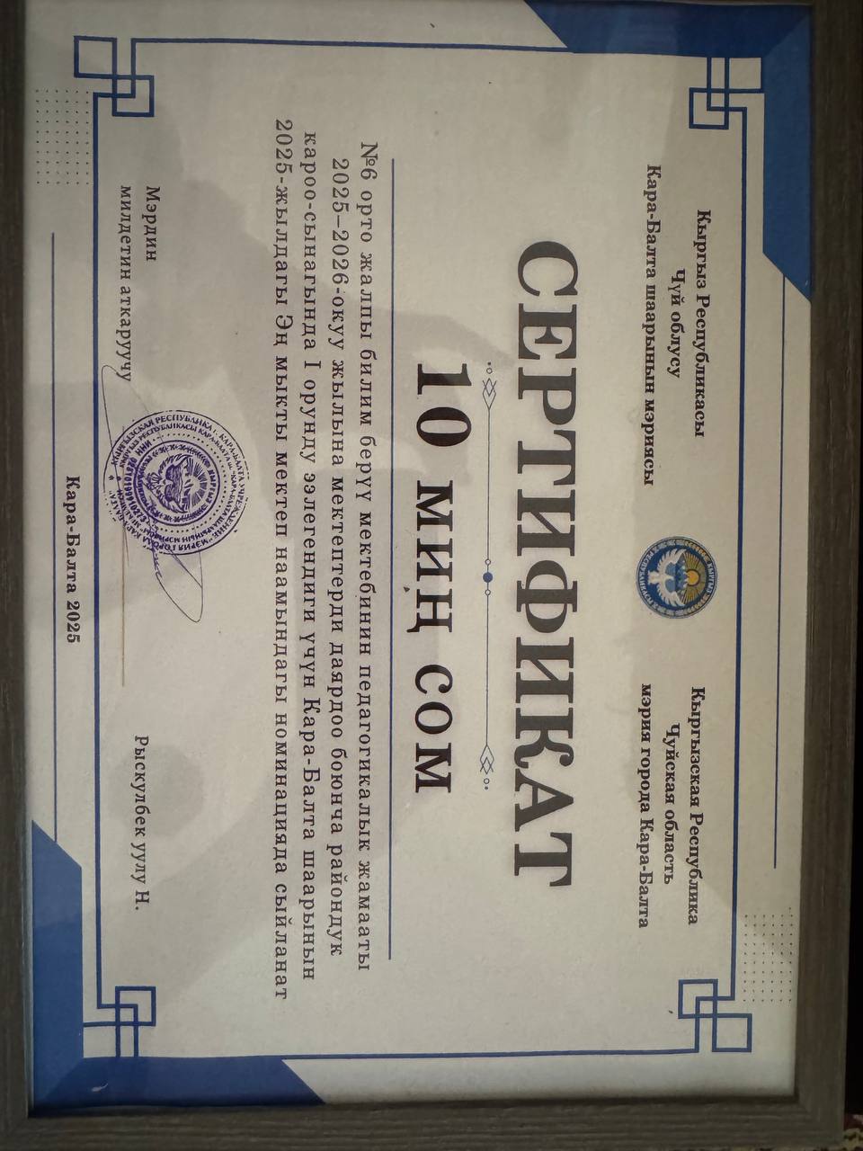 Аильчинова Айжан Ийсаевна, учитель кыргызского языка награждена грамотой мэрии г. Кара-Балта